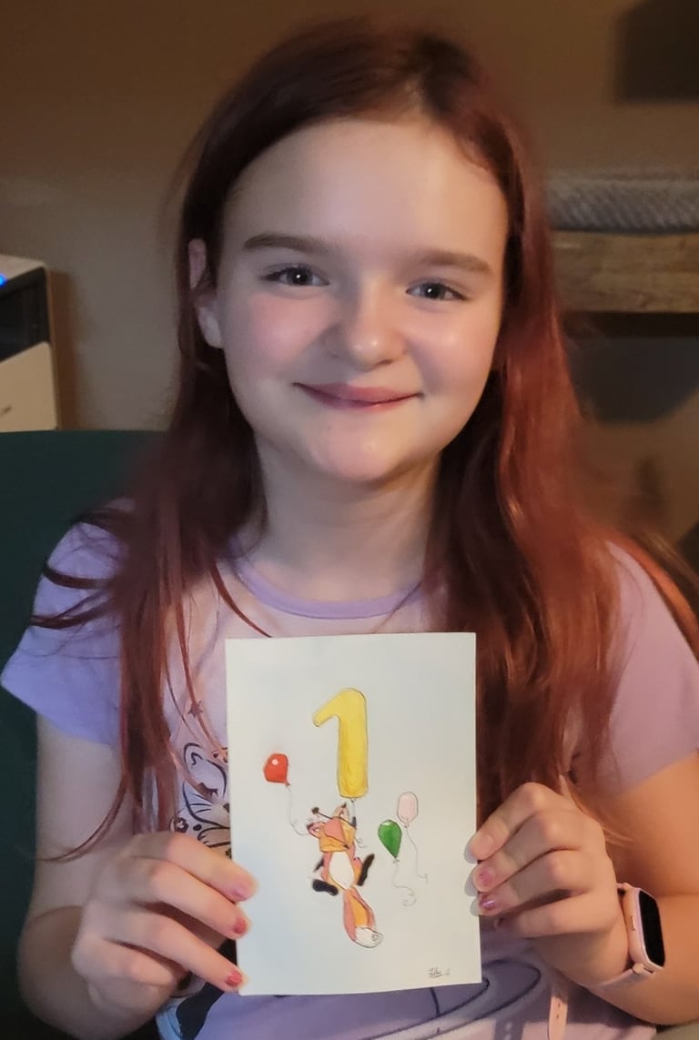 Lily was so excited to paint a 1st birthday card for a friend's son. She found a picture she liked online and copied it, but also made it her own. She outlined it and added details with Micron pens and painted it with watercolor.