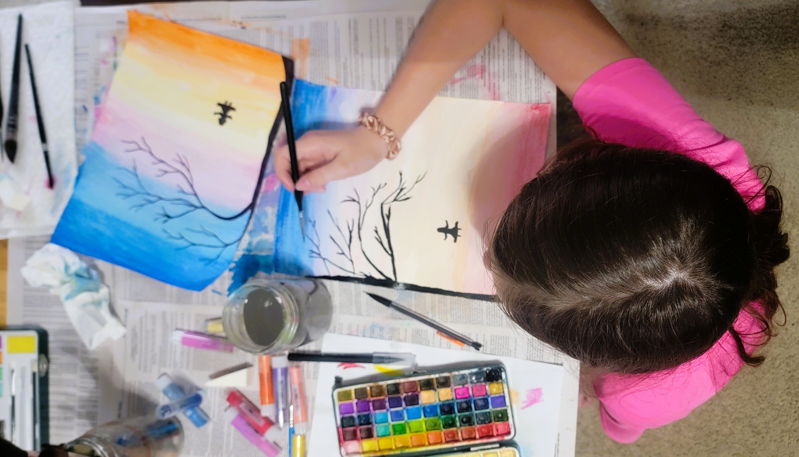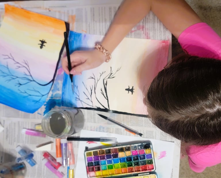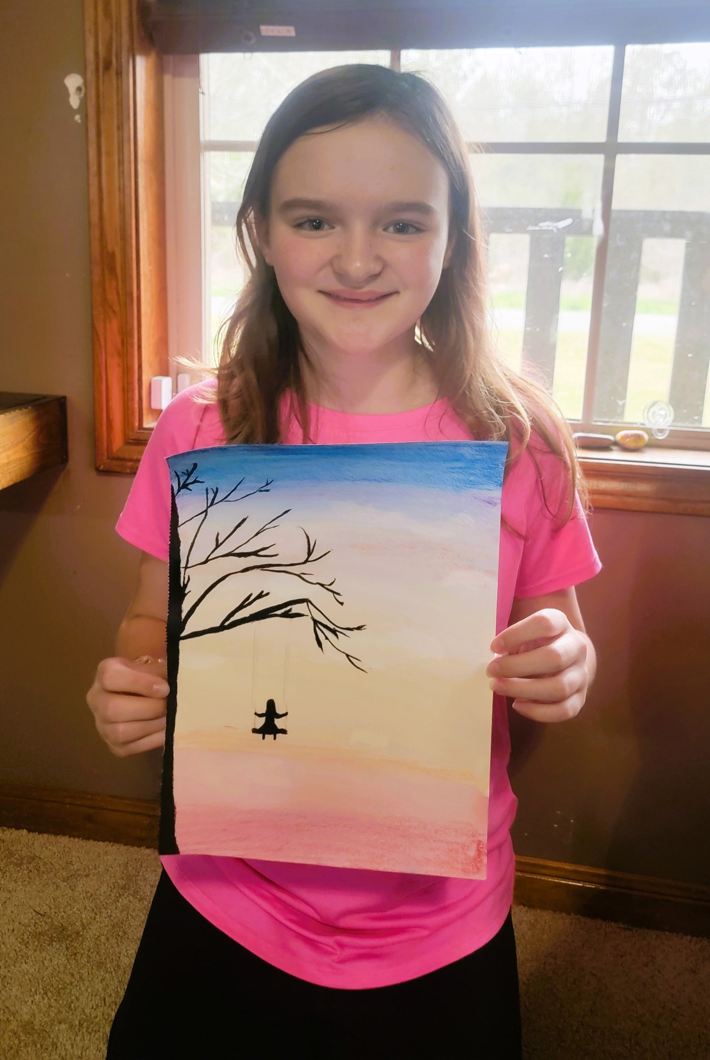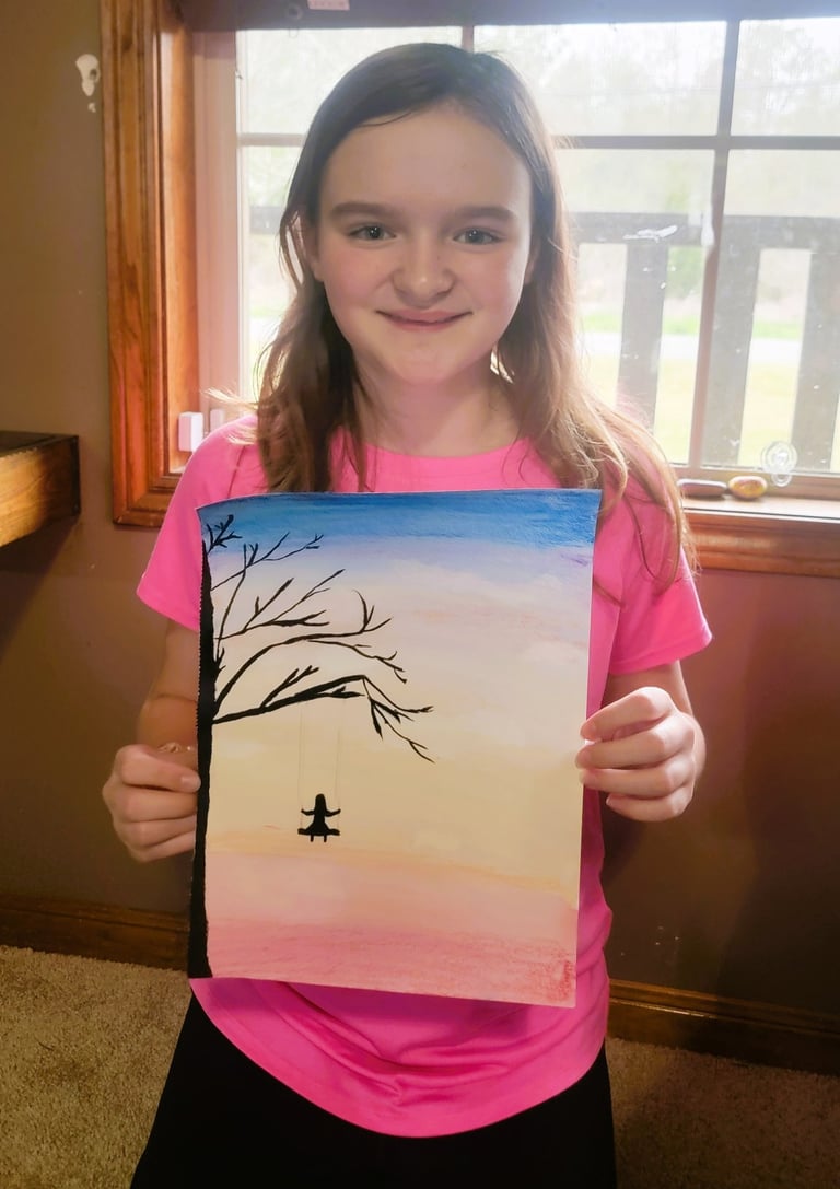 Lily wanted to paint this afternoon. We decided to use some Faber-Castell Gelatos. We haven't used them much so far, so I thought it would be a fun switch. She found a watercolor tutorial online but switched out the colors for gelatos. She used black watercolor for the tree, branches, the swing, and the girl.